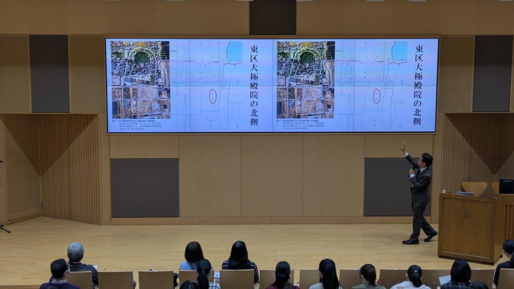 遠藤先生によると、奈良時代の古文書に残る数少ない情報と、平城宮跡の地に伝わる小字地名から、聖武天皇の母である藤原宮子がどこに住んでいたのかが判明したとのこと。若い頃から古代文書の研究を続けてこられ、長く関西にお住まいで土地勘もある遠藤先生ならではの研究成果です。