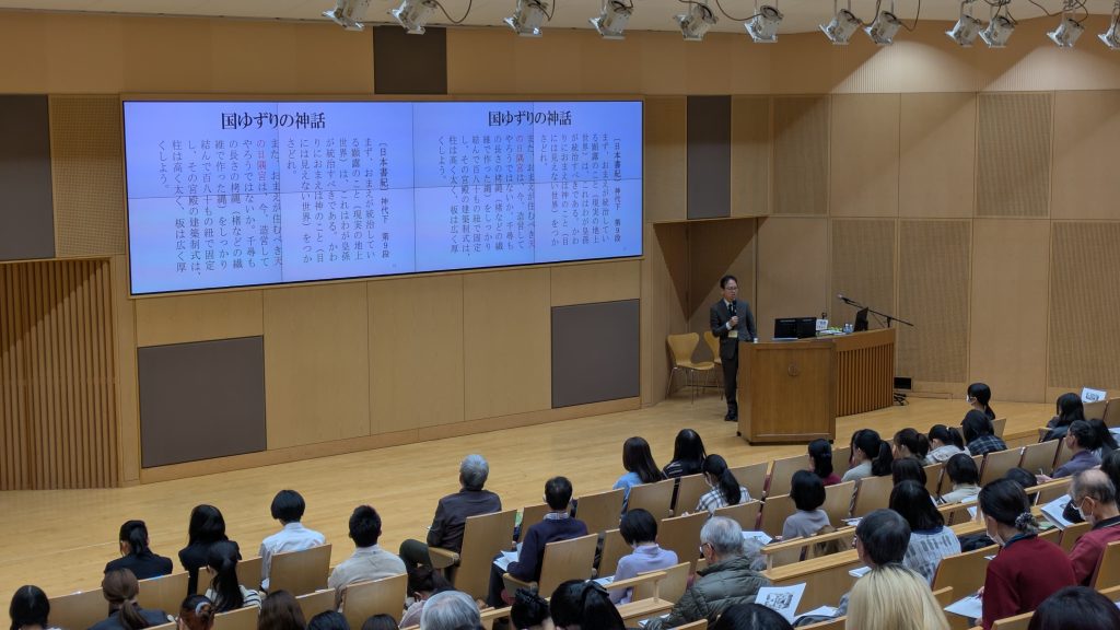 続いて遠藤先生からは、お勤め先の皇學館大学の学生を引率して出雲大社へフィールドワークに行かれた際のお話をいただきました。出雲大社の祭神である大己貴神(おおなむちのかみ)の神座が西を向いており、現在の大社にも西から社殿を拝む場所があることや、大社の西にある稲佐(いなさ)の浜で砂を取って素鵞社(そがのやしろ)に供える習俗について地元の方に教わったことなど、現地での見聞が研究の広がりに役立ったとのお話がありました。