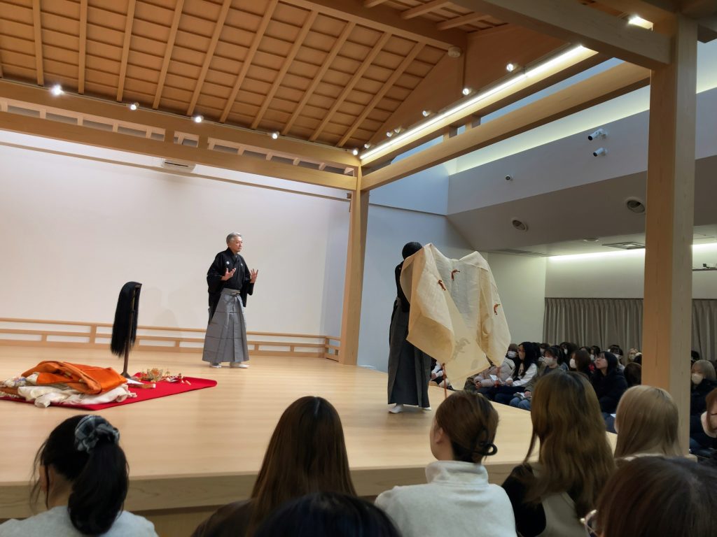 能という芸能を役者さんによる実物を用いた説明、体験を通して学ぶことができました。本物を見ていると理解がとてもしやすかったです。体験では普段ではできない貴重な経験を得ることができました。次回の授業では実際に演目を見られるという事だったので楽しみだと思いつつ、この日の授業は終了しました。